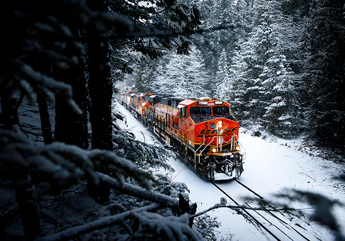 Winter is tough, weather we like it or not, but it’s also beautiful. When snow blankets the landscape, railfans get the chance to wrap up, venture outside and snap winterful photos of BNSF’s bright orange locomotives against a crisp, white backdrop