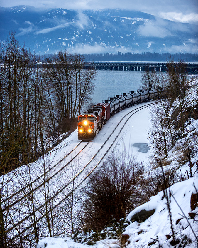 Approaching the community of Lignite, Idaho, just after crossing Lake Pend Oreille, a westbound crude oil train cruises through the snow on a cold, rainy morning.