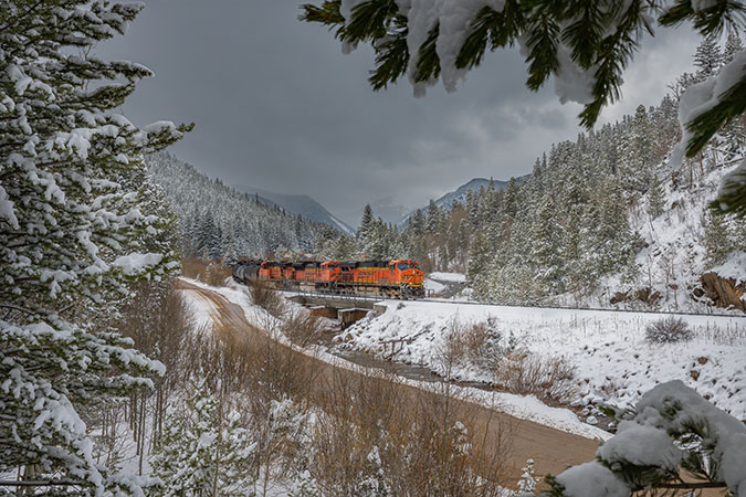 A BNSF mixed freight glides over the Great Divide in Colorado on a slightly cloudy day. The contrast between the snow-covered landscape and the emerging sunlight creates a magical scene, capturing the essence of winter railroading. Lindgren’s photo encapsulates the serene beauty of a winter's day.