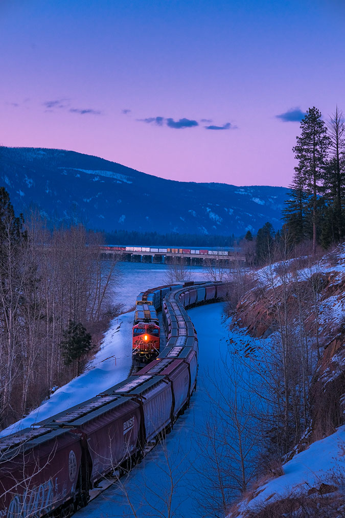 A mixed manifest freight winds north through subzero conditions in Sandpoint, Idaho, passing a grain train. The harsh winter environment is no match for these powerful BNSF trains. This photo showcases the relentless spirit of railroading in extreme weather.