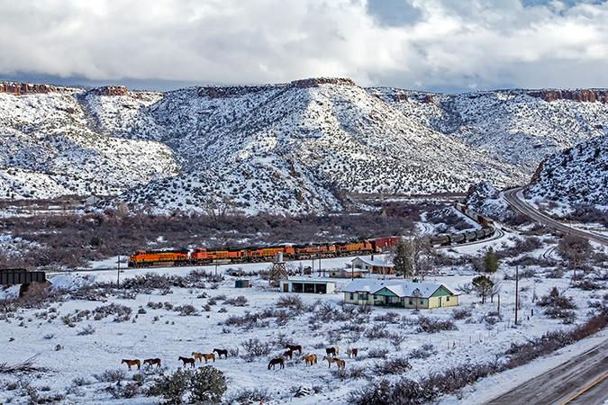 A BNSF train moves through the snowy desert near Valentine, Arizona, passing grazing horses and quiet ranches beneath mountain peaks. Locomotive Engineer David Carballido-Jeans beautifully encapsulated the magic of winter in one photo.