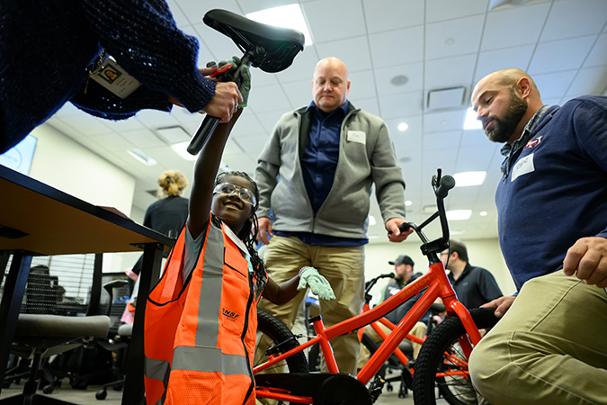 In the photos: During 2025 PLT sessions, BNSF employees enjoyed the chance to work with local students to complete team STEM exercises and build and donate 1,110 bicycles.
